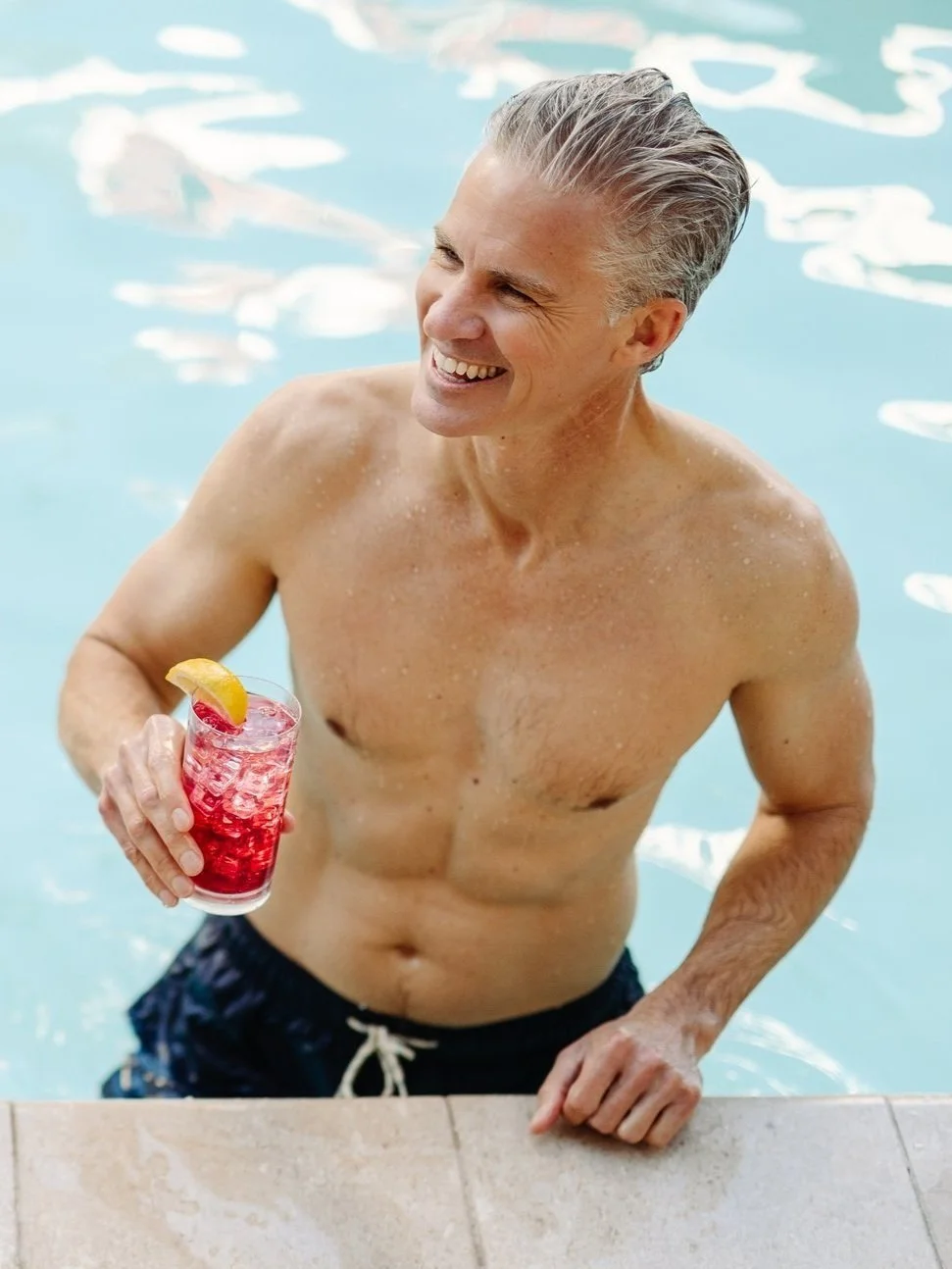 An attractive smiling man with silver gray hair in a swimming pool holding a red drink with a lemon slice garnish. Tim Kusserow model.