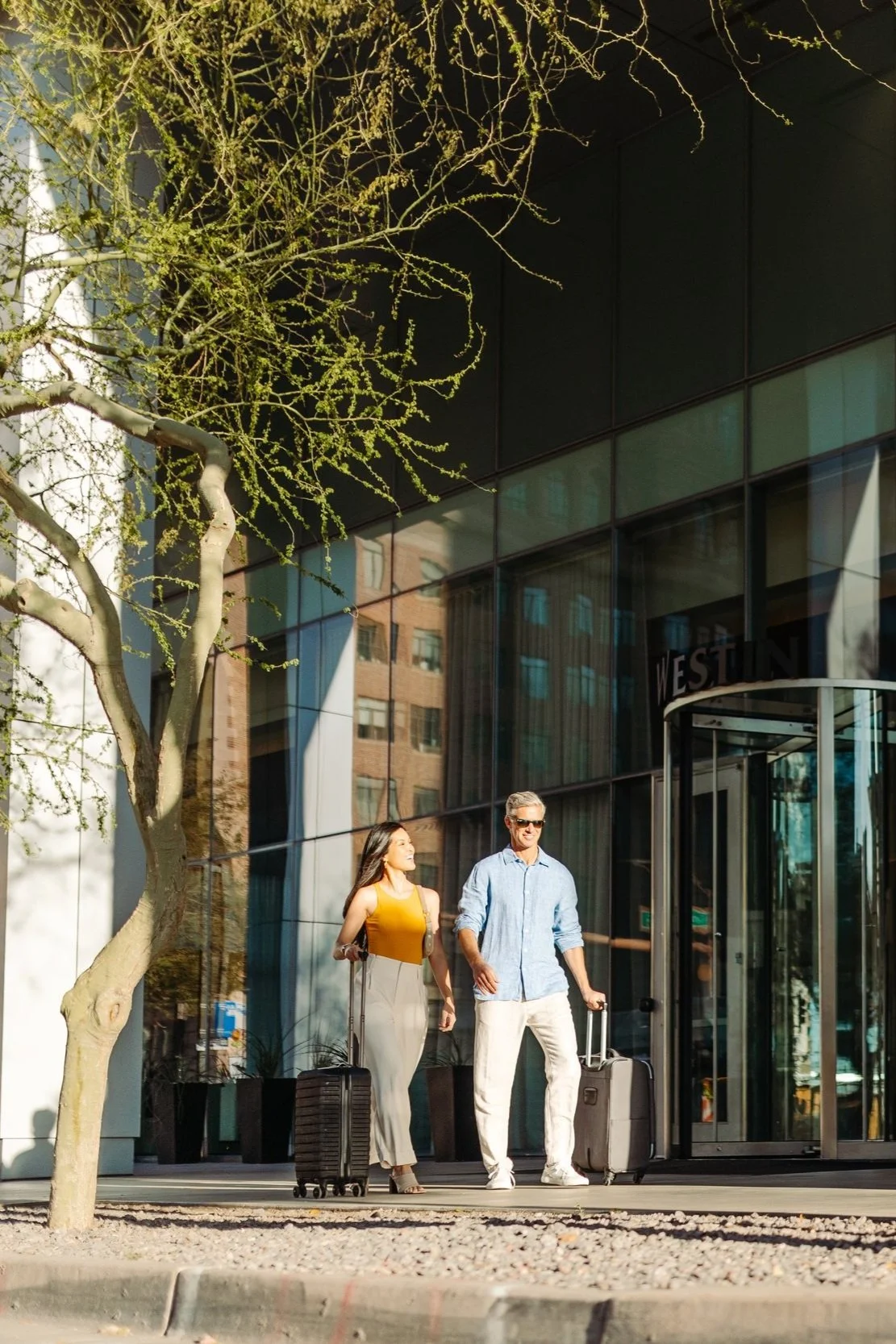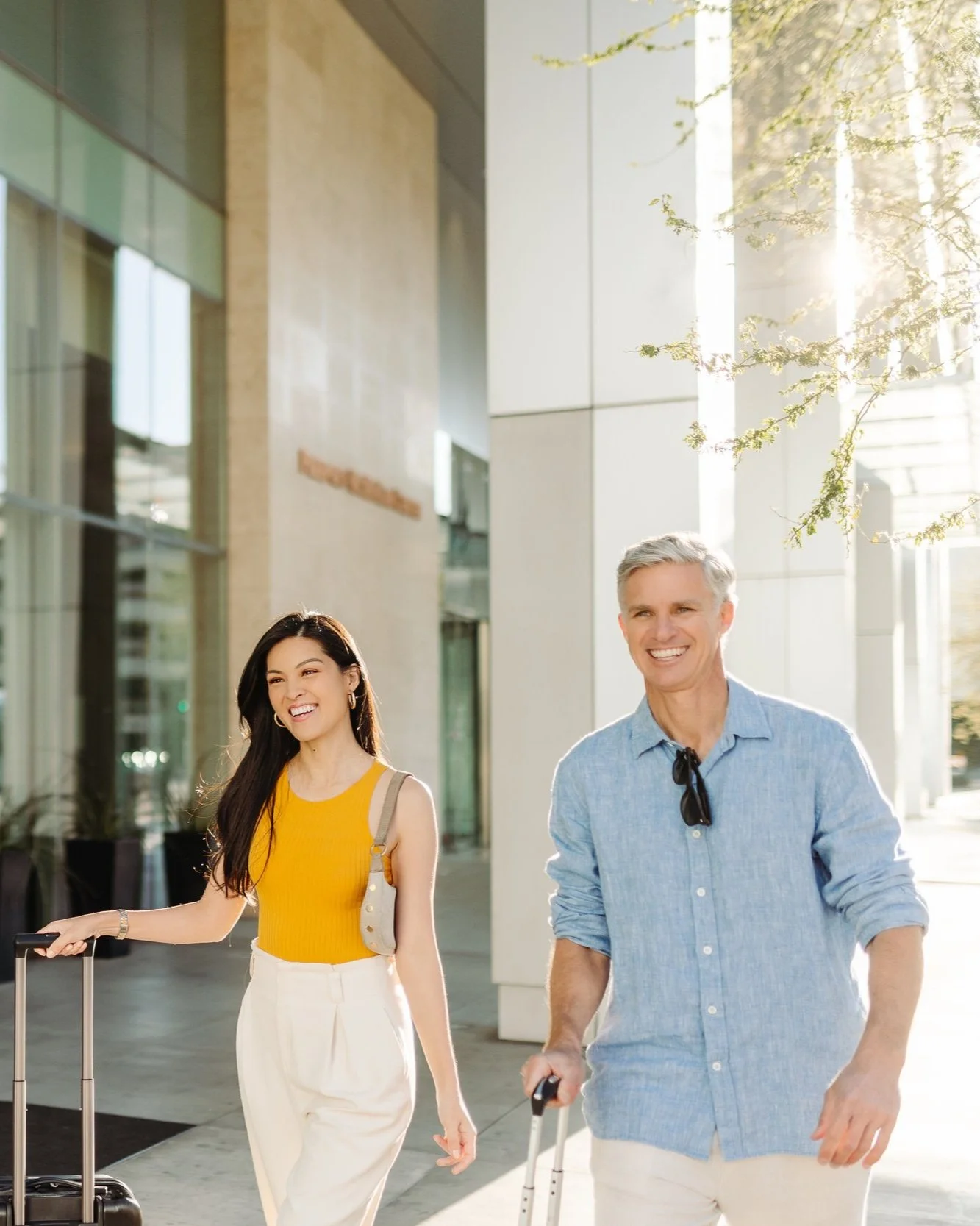 Aspirational man and woman walking with luggage outside a modern building during daytime. Tim Kusserow model.