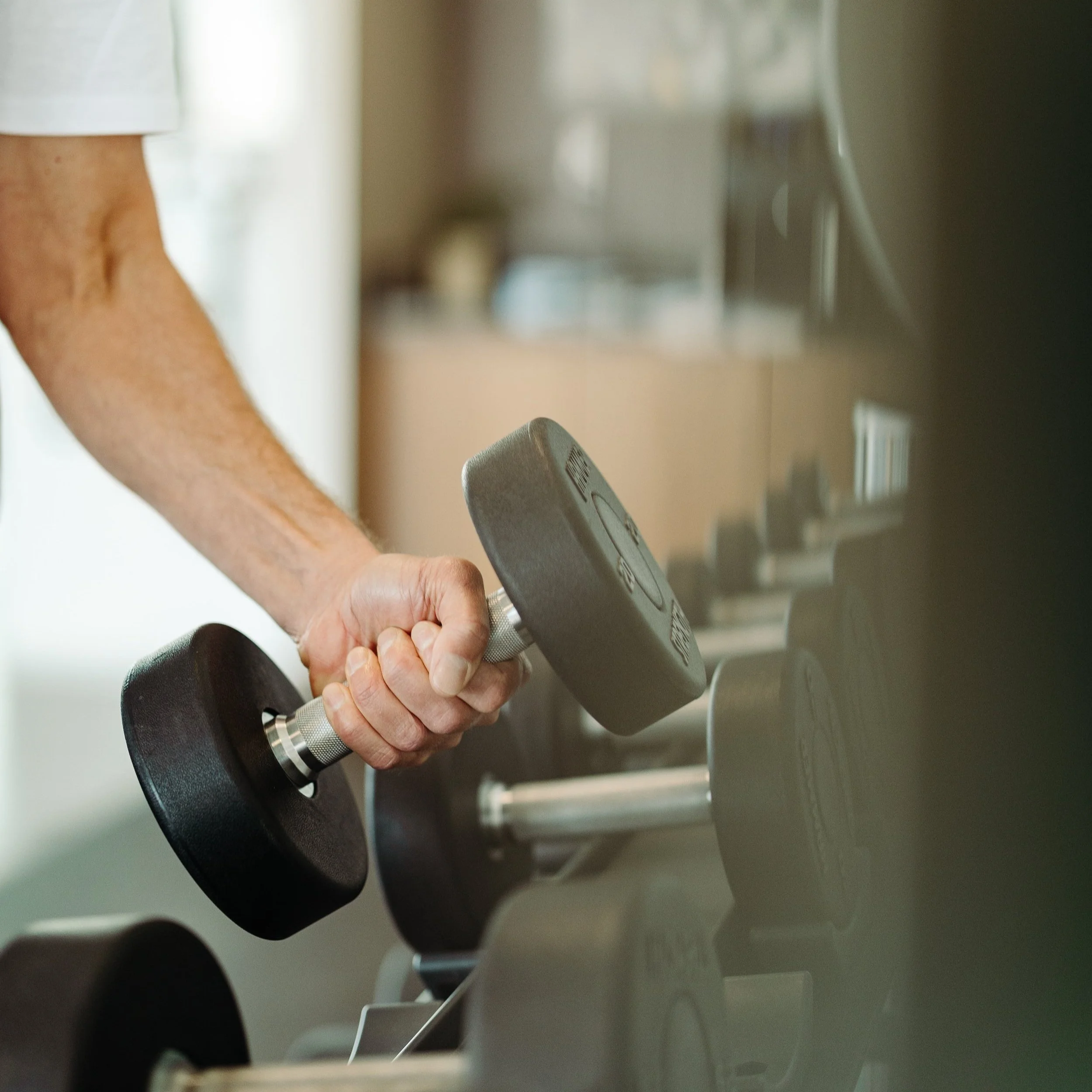 Person picking up a dumbbell from a weight rack in a gym. Tim Kusserow model.