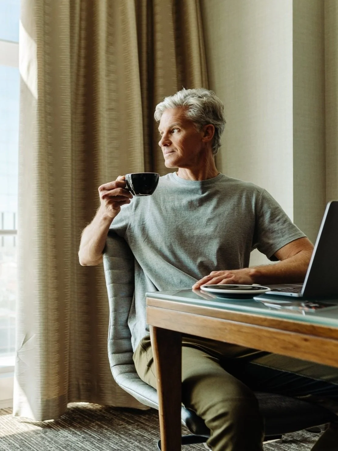 Aspirational middle-aged man with silver hair sitting at a desk with a laptop, holding a coffee cup, looking contemplatively out the window. Tim Kusserow model.